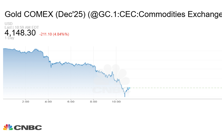 كما انخفضت العقود الأميركية الآجلة للذهب تسليم ديسمبر كانون الأول بنسبة 4.84% لتسجّل 4148.30 دولار للأونصة.