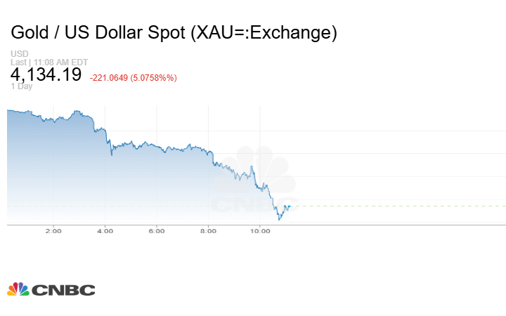 وتراجع الذهب في المعاملات الفورية بنسبة 5% إلى 4134.19 دولار للأونصة، وذلك بعد تقليص خسارته التي وصلت إلى 6.3% مسجلا أسوأ أداء يومي منذ أبريل/ نيسان 2013 بعدما بلغ مستوى قياسياً عند 4381.21 دولار يوم الاثنين.