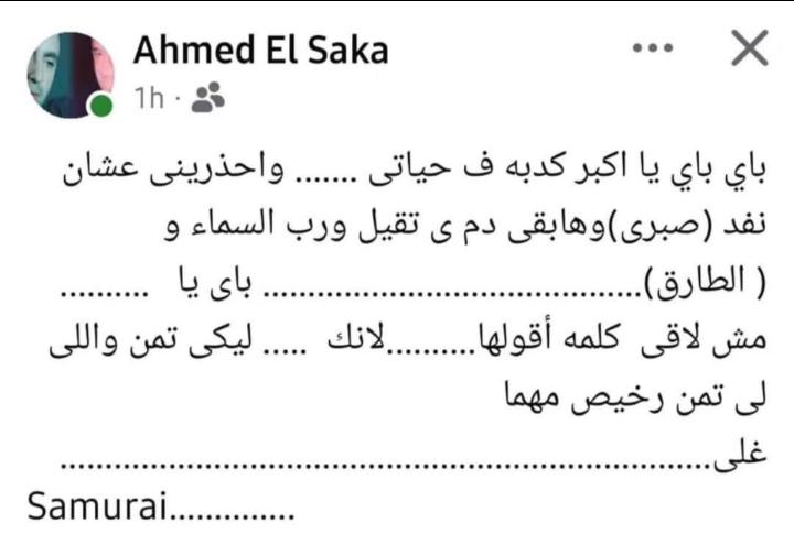 و كتب عبر فيسب على فيسبوك: “باي باي يا اكبر كدبه ف هايتا واحظريني عشان نفد (سبرى) وهابقى دمى تقيل ورب السماعا (الطارق ) باي YA مش لاقي كلمه اقلىها لانك ليكي تمن واللى لى تمن رخيس هما غلى”.