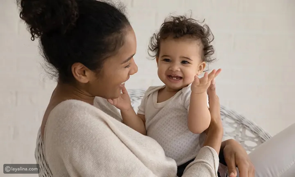 ظظهار وجوه مضحكة وتقليد الأصوات: الطفل يحب التفاعل الصوتي والمرئي في هذه المرحلة.