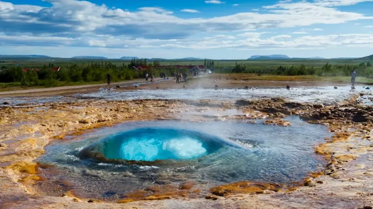 شرق العاصمة ريكيافيك ، يتفجر النشاط الجيولوجي في في ف هاوكادالور »حيث العيون الساخنة والينابيع المتفجرة ثل غل» » و «ستروكور”.