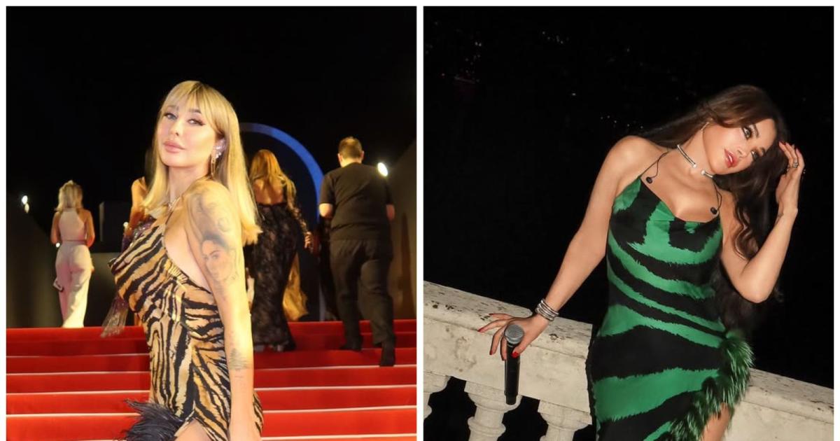 في توارد الافكرة لافت, جويل المدينيان في في الحجمة الجونة كيناماعي 2025 بفستان بنقشة الزيبرا من جودة روبيرتو كافاللي Roberto Cavalli لموسم الخريف وشتاء 2000 Italy لكن بلون different.