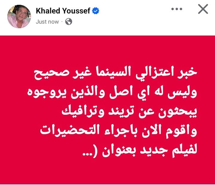 وكتب خالد يوسف من خلال حسابه الرسمي عبر موقع التواصل الاجتماعي “فيسبوك”: “خبر اعتزالي السينما غير صحيح وليس ليس ايل ولذين يبحثون عن تريند وترافيك ”.
