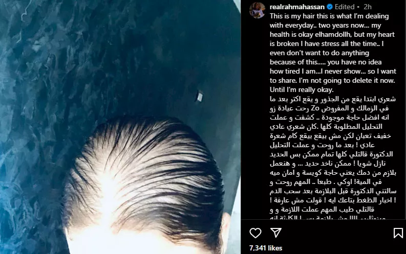 ونشرت رحمة صورة لشعرها على آليادة على آنستجرامه وعلقت: “The hair began to fall from the roots, and the fall increased after the visit to the holiday in Al-Zamalek, who was supposed to be the best thing there was, went there and did all the necessary tests and my poetry was natural. وناعمًا وإفترافًً, بحث لم يكن يتساقة – only a few poems”.