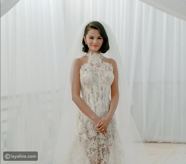 شاركت سينا غوميز Selena Gomez صوراً من زفافها عبر حسابها الشي على تطبيق إنستغرام. الفستان صُمّم لها خصيصاً بتوقيع دار رالف لورين ، وتميز بياقة علية على شكل هالتر مزينة بالدالريق حول حولعنق.