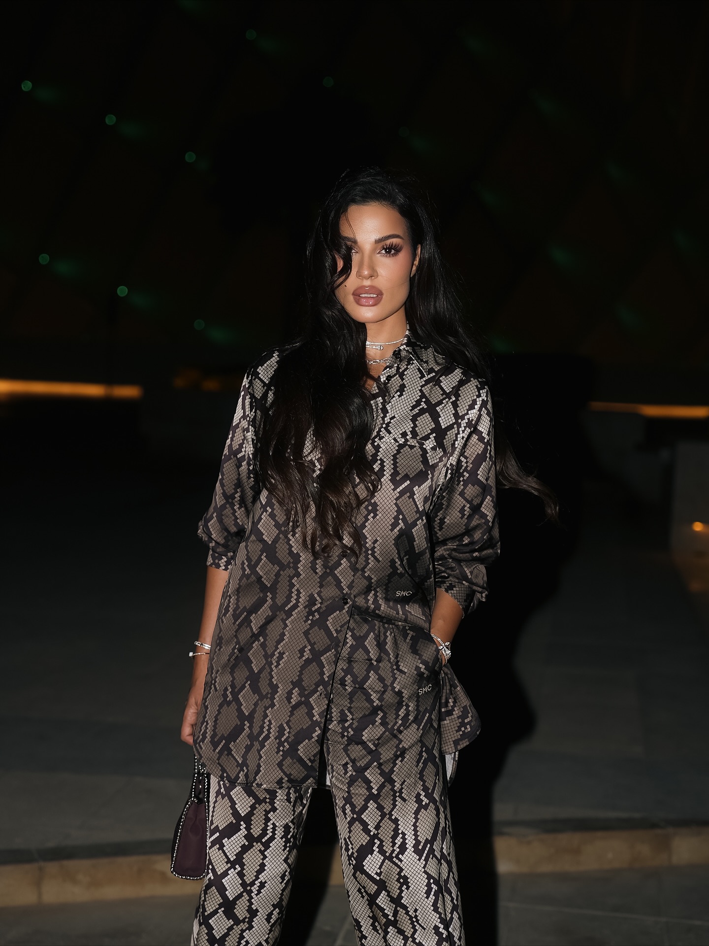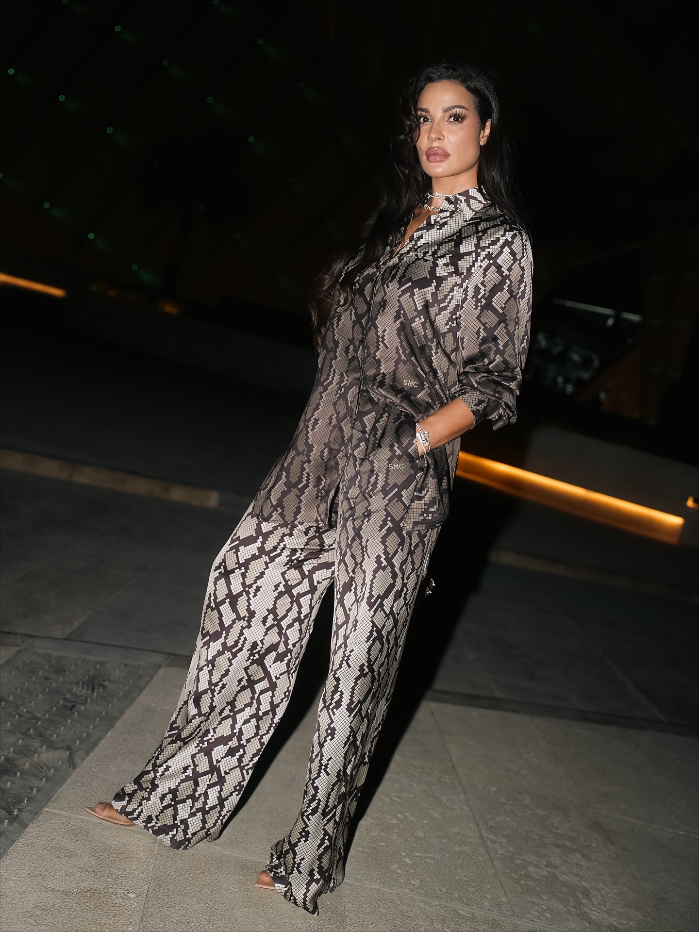 أطلت نادين نسيب نجيم بطقم “بيجاما” بنقشة جلد الثعبان بدرجات اللون الرمادي، واسعا.