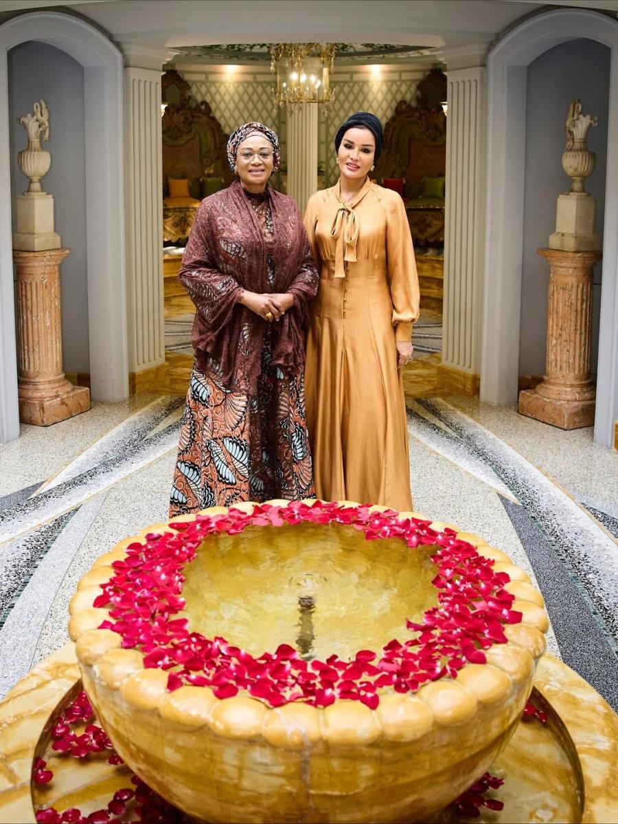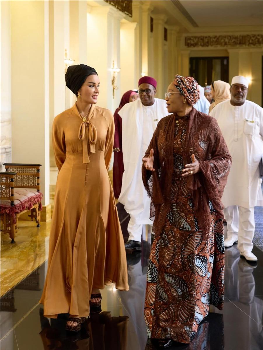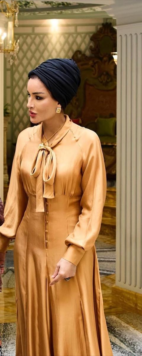 During the reception of the first lady of Nigeria at Qasr al-Wajba, Sheikha Moza drew attention with an elegant and elegant look. Classic and warm autumn touches, in an attractive autumn blue dress paired with an elegant turban and soft jewelry.