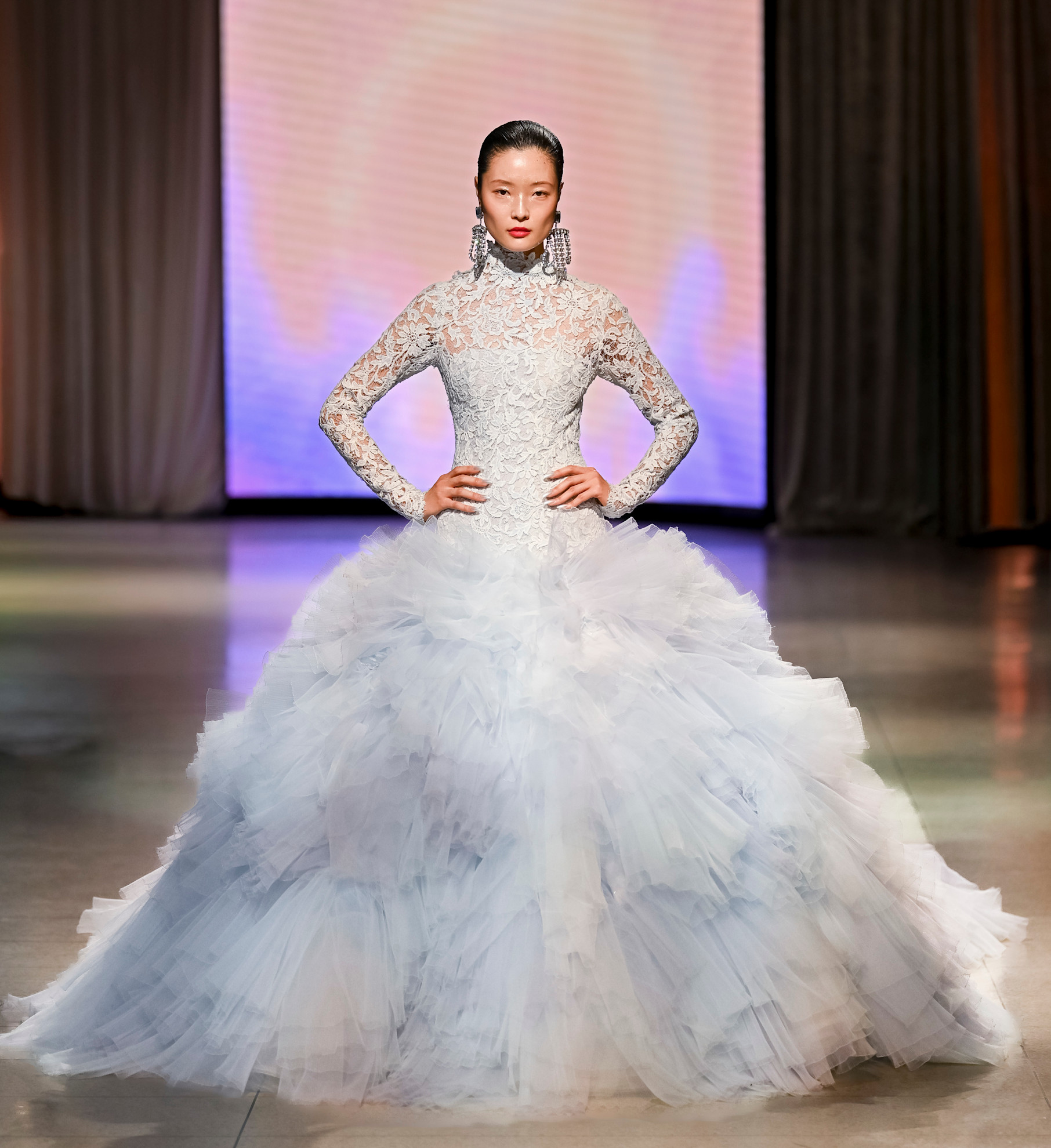 لم تكتفِ إيناس دي سانتو بالبياض التقليدي، بل فتحت أبواب الحلم على مصراعيه عبر فساتين ملوّنةتدرّجت ألوانها بين الوردي والأزرق والزيتي والمعدني، لتتحوّل منصة عروض نيويورك إلى حديثة ملوّنة وتحفة آسرة. هذا التنوع اللوني عبّر عن حرية جديدة في عالم الزفاف، ومنح العروس فرصة لتكون ذاتها كما هي: رومانسية، حالمة، وجريئة في الوقت نفسه.