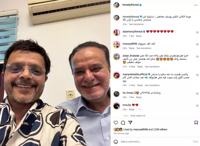 نشر هنيدي ورة تجمعه بيوسف معاطي عبر حسابه على انستجرام وكتب: ” عابدين بإن الله “.