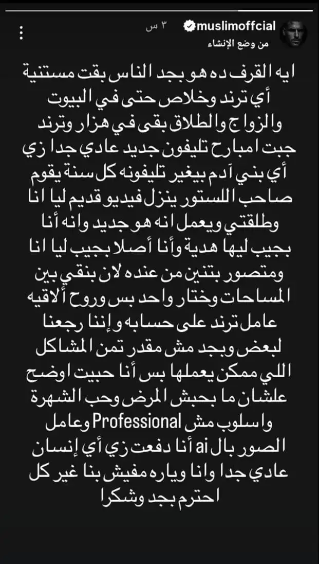 وأعرب مسلم عن انزعاجه من تداول أخبار غير دقيقة تخص حياته الشخصية، معتبرًا أن البعض يسعى إلى تحقيق الشهرة على حسابه من دون مراعاة لتبعات ذلك.