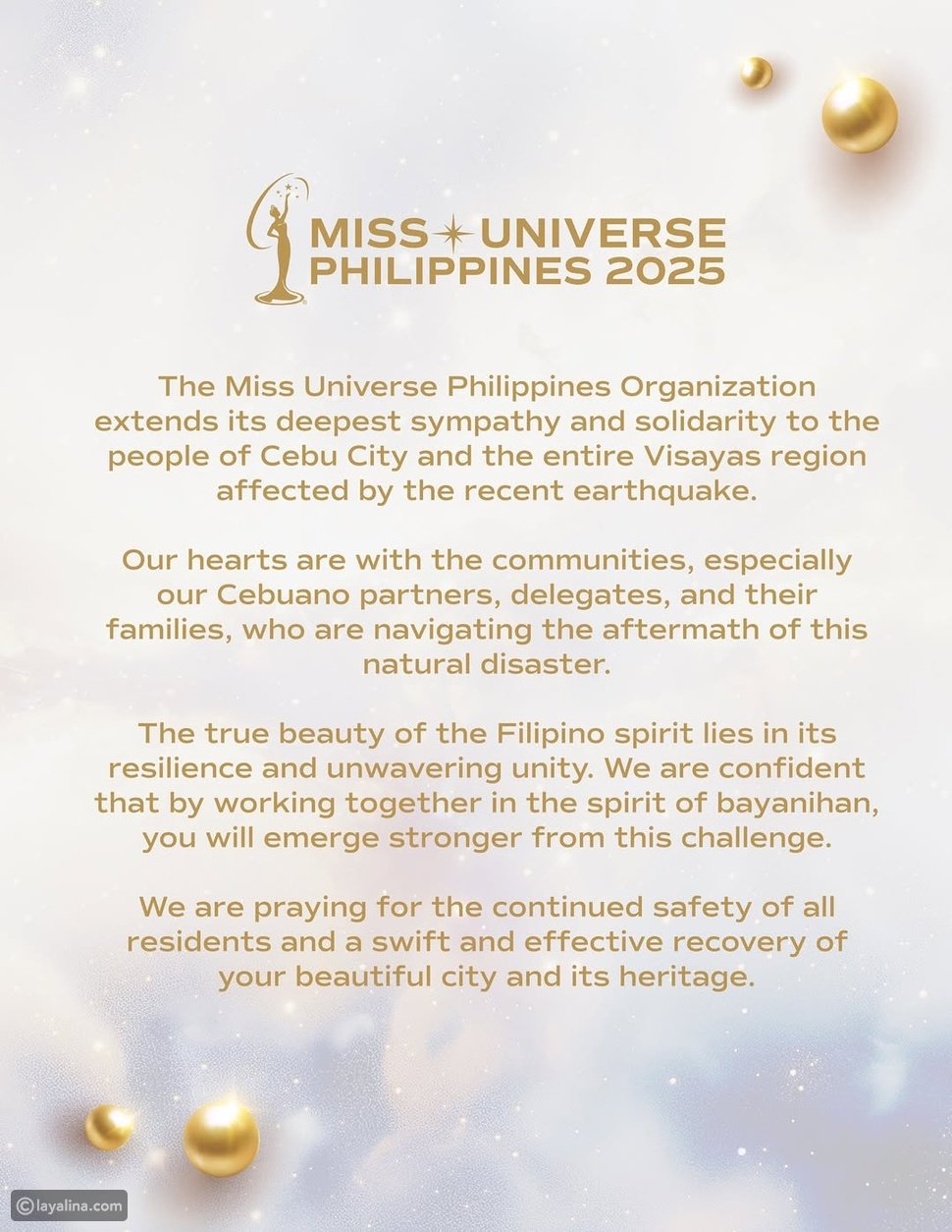 وقالت المنظمة في بيانها: “عقب زلزال الفلبين ، نود أن أن ️ متسابقات ملكة جسيا والمحيط الهادئ 2025. نشكر فندق راديسون بلو على سرعة استجابته وتنفيذه لإجرات الإلاء الآمنة “.
