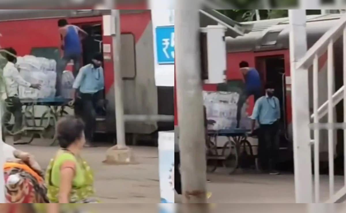 सोशल मीडिया पर एक अनोखा वीडियो तेजी से वायरल हो रहा है, जिसमें चलती ट्रेन के साथ-साथ एक ठेला भी दौड़ता नजर आ रहा है. यह नजारा रेलवे प्लेटफॉर्म के पास देखने को मिला, जहां ट्रेन धीमी गति से आगे बढ़ रही थी और उसके साथ ही कुछ लोग ठेले को लेकर चलते नजर आ रहे थे. वीडियो में देखा जा सकता है कि ट्रेन के एक कोच के दरवाजे के पास कुछ लोग पानी की बोतलों से भरे एक ठेले को लेकर आगे बढ़ रहे हैं. सबसे चौंकाने वाली बात यह है कि एक शख्स ठेले पर चढ़कर चलते-चलते पानी की बोतलों के पैक ट्रेन के अंदर फेंक रहा है. यह पूरी प्रक्रिया इतनी कुशलता से की जा रही है कि बोतलें सीधे अंदर गिर रही हैं और यात्री उन्हें आसानी से पकड़ रहे हैं.