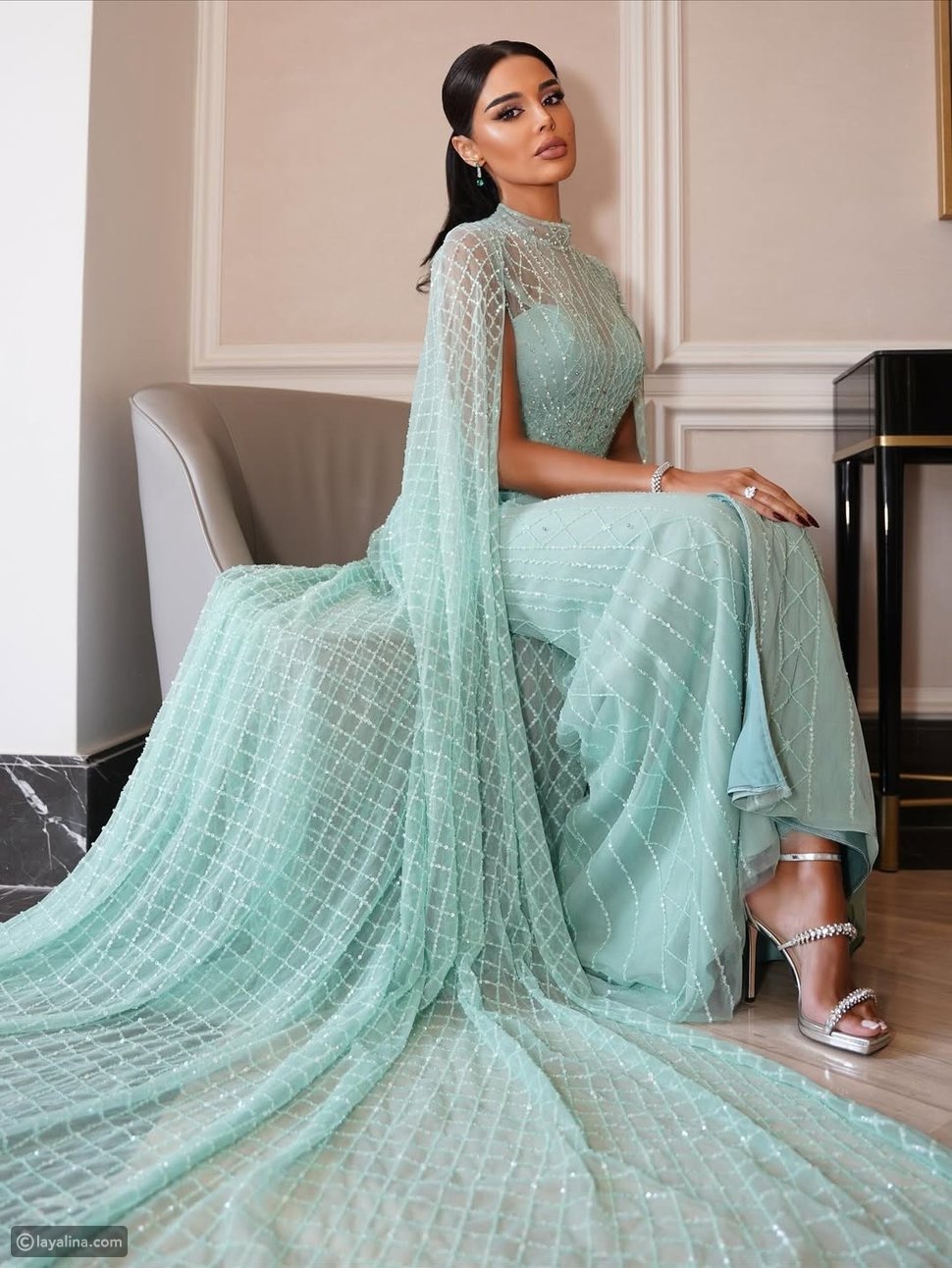 As it appeared in عدنان عكبر بفستان مخملي اسواد مترز بخيوت زهابية مستوحة من طبيعة الملكة, همل توقوي رضوى اكبر. But in the performance of Al-Aqeeli, she chose an elegant marble dress in the color of pastel sea green, with a luxurious classic cut with style. Al-cab and open-back, and he finished his hair with soft hair.