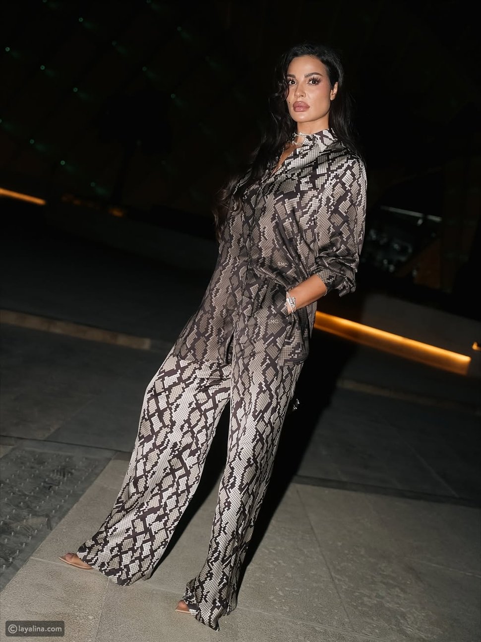 Nadine Njim chose a look that was made of a shirt and pants with a patterned skin in shades of gray and black, with a wide design, from the signature مكارنتي عابهً, والحياة في المديرة العربية العربية.