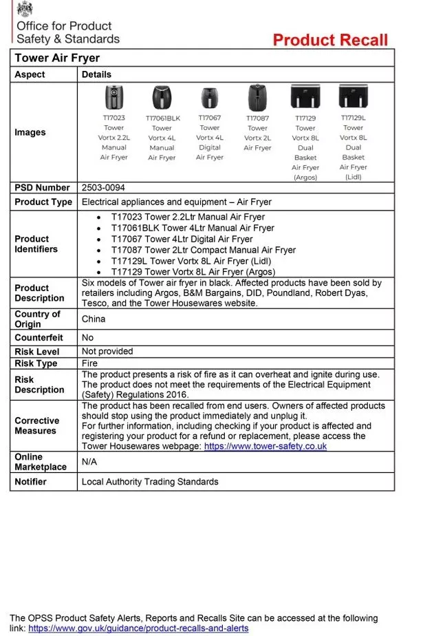 SIX MODERS OF TOWER AIR FRIERS HAVE BEEN RECALLED OVER FEARS THEY COULD OVERHEAT AND CATCH FIRE.