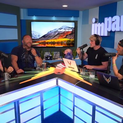 Paul teased Jones’ appearance in a tweet earlier in the week, including a clip from the episode. Jones flips off the camera and yells, in the midst of a nearly incoherent rant, “Fuck everyone.” Paul and his co-hosts, Spencer Taylor and Mike Majlak, laugh at Jones’s antics. It’s only four seconds long, but if you were to use your imagination and conjure up what Logan Paul and Alex Jones in a room would look like, you probably wouldn’t be that far off.