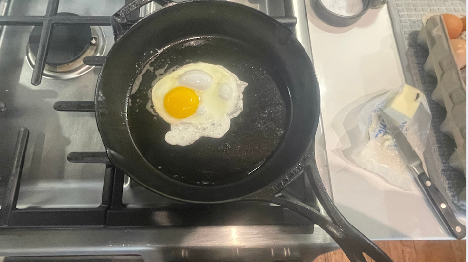 If you preheat a cast irone pan (here, I used the lodge Blacklock) and add a bit of butter or cooking, sliding fried Eggs off the surface should be as it is with a coated nonstick pan. (Lisa Schweitzer/Yahoo)