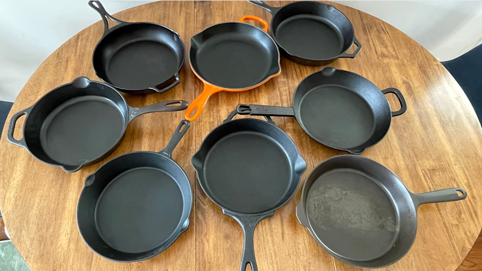 It’s a pan party! Once you see the skillets together, you can easily spot the differences in the handles and pour spouts. (Lisa Schweitzer/Yahoo)