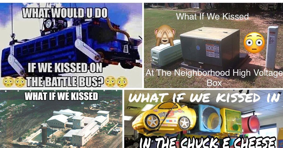 “What would u do… if we kissed on the Battle Bus?” one image macro asks, referencing the popular game Fortnite. “What if we kissed in the Blair Witch House?” asks another. They grow increasingly specific. “What if we kissed in the Waco compound?” another wonder. “What if we kissed at the neighborhood high voltage box?” yet another image queries. Oftentimes, the images use the classic Impact font often seen on old-school memes, and are adorned with blushing emoji and the emoji of a monkey gleefully covering its eyes, seemingly out of adorable embarrassment.