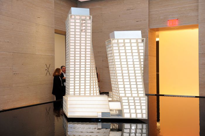 One reason Feldman shrugged off naysayers was because he had bagged Bjarke Ingels, one of the most sought-after architects in the world, to design the XI. Starchitects can charge as much as 25 to 30 percent more than their lesser-known colleagues, and Ingels was all but guaranteed to deliver a complicated, expensive design, but that didn’t matter to Feldman. Partnering with the young, swaggering Dane would send a message to the entire industry: HFZ was ready to leave its mark on the Manhattan skyline. The final plans called for the top floors of the XI’s two towers to cantilever over the shared base by 50 feet, so they seemed to be leaning, unnervingly, like the Tower of Pisa. Engineering reports talked of “torsional irregularity” and “gravity load induced lean,” which added to the “inter-story seismic drift.”