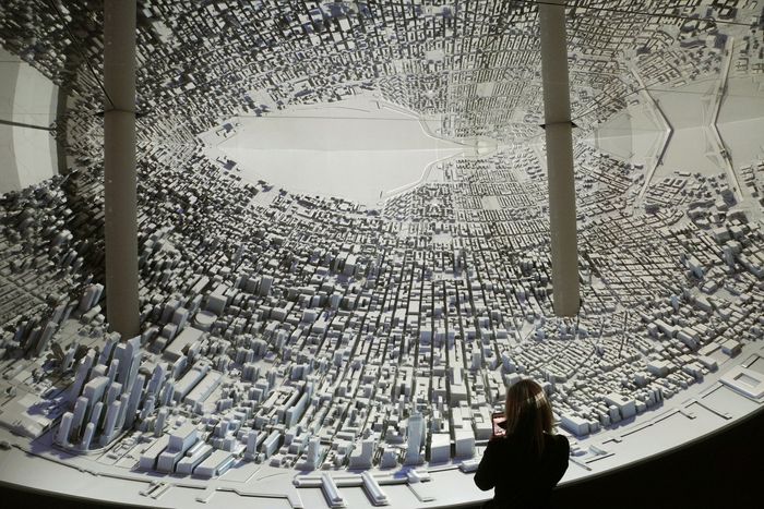 By January 2018, some 800 workers were employed at the site. Rebar shot out of the ground like fingers poised to pull the rest of the building up behind it. After the concrete was poured, Ingles’s design took shape, and the first of the building’s 11,000 travertine panels, imported from a quarry in Tivoli, was put in place. Someone called 311 to report “a building that is leaning south.”