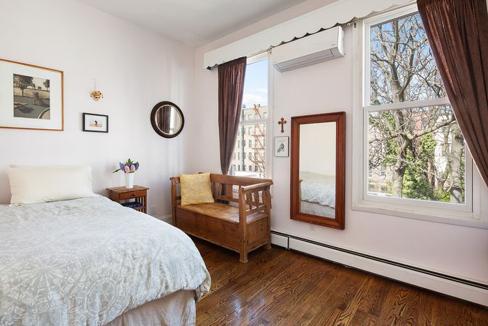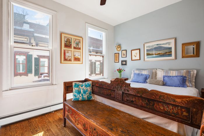 The primary bedroom overlooks Charming Sylvan Terrace Through Quieting, Double-Paned Glass. The Bench is an Antique From Sweden. Not Shown is a Walk-in Closet Lord Sometimes Works From, Which She Calls Her “Cloffice.”
