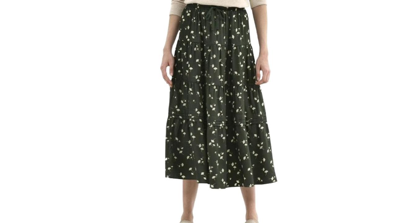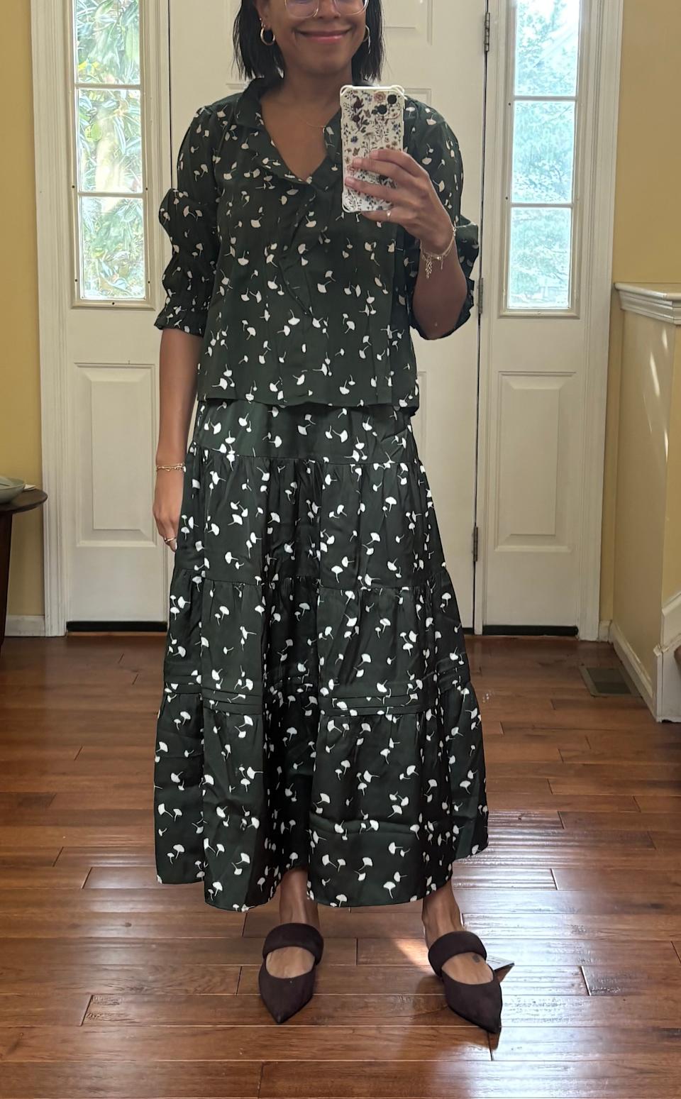 Unlike the top, which is made from a cotton-blend fabric, this skirt is made from polyester that has a silkier, finish shop. That means the pieces don’t look great together, but they’re stylish on their Own. I love the full, Flowy Cut of the Skirt and Could Definitely See MySelf Wearing It With Ankle Boots A Cute Kitten Heel.