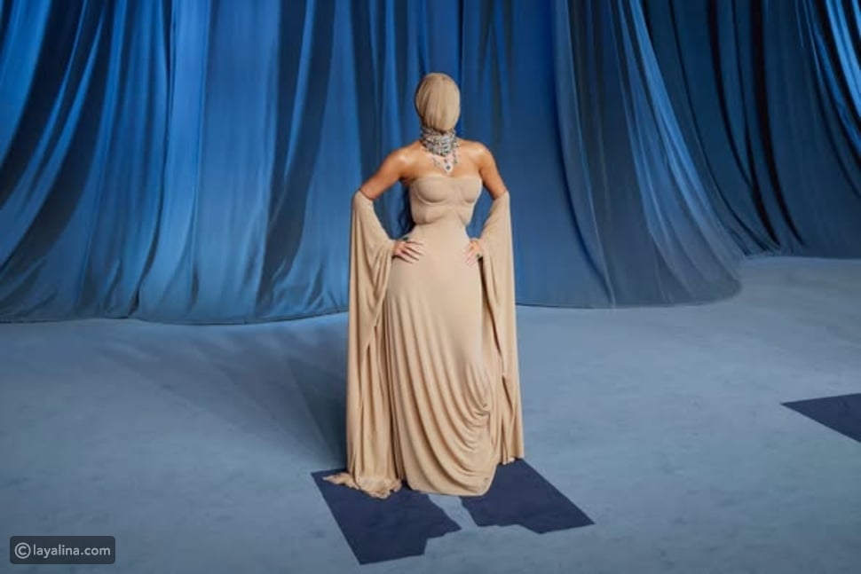 The look that caused a great stir was characterized by a floral dress, perfectly matched with her skin tone, and with a suitable design that combines the structure classic and future details, except that the most interesting element was the qanaa that covered her face almost completely, leaving space ديقة للعينين only, and I justified this choice by saying that it is “similar to what the Skims trademark produces”, in reference to the similarity in فیکر “الجلد ثانی” التیا علیہ علیہ توردہها.