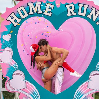 So, during the Run the Bases challenge, Belle-A decides to start kissing the boys. The challenge is your standard, semi-obscene Love Island fare, related to baseball in only the very loosest sense and involving a grotesque use of food — bobbing for baseballs in buttered popcorn, slathering one another in ketchup, passing a Popsicle between mouths, etc. — with the girls each assigning a boy to a base according to personal ranking. Everyone expects Belle-A to opt out of the slobbering that is an encouraged, but not mandatory, part of the game. But instead, she comes out of the gate tongue-first and makes out with every boy on her lineup, eliciting a proud, “Our baby’s growing up!” from Olandria. And it’s enough to shift Nic’s personal rankings from 70/30 Cierra to an even 50/50 split between them.