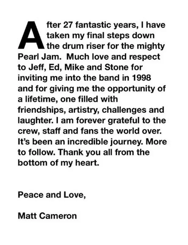 Pearl Jam’s statement reads: “From being one of our first musical heroes in the bands Skinyard and the mighty Soundgarden, to playing on our first demos in 1990, Matt Cameron has been a singular and true powerhouse of a musician and drummer.”
