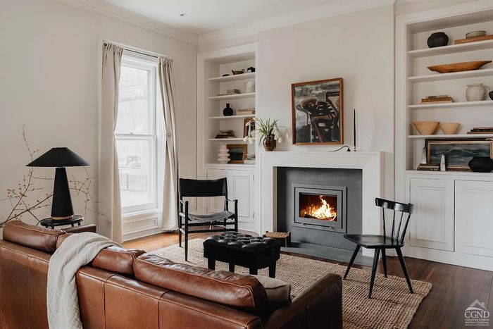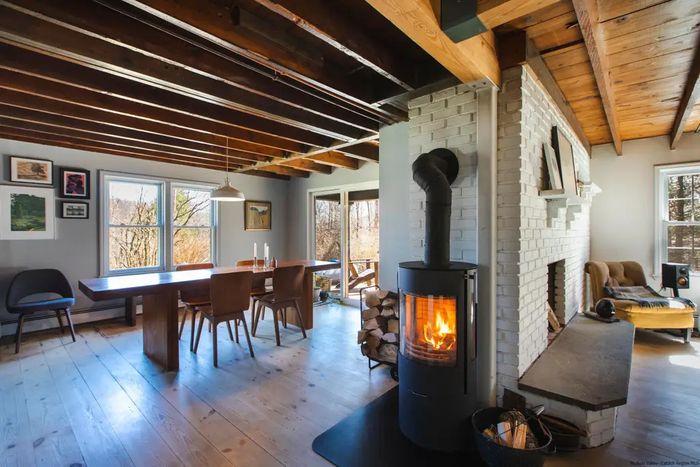 The listing Photo Shows off updated interiors like the Rais Wood Stove.