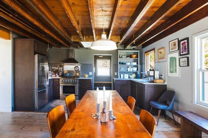 The exposed beams and open-concept kitchen in this listing Photo Show off the luxury version of living in the woods.