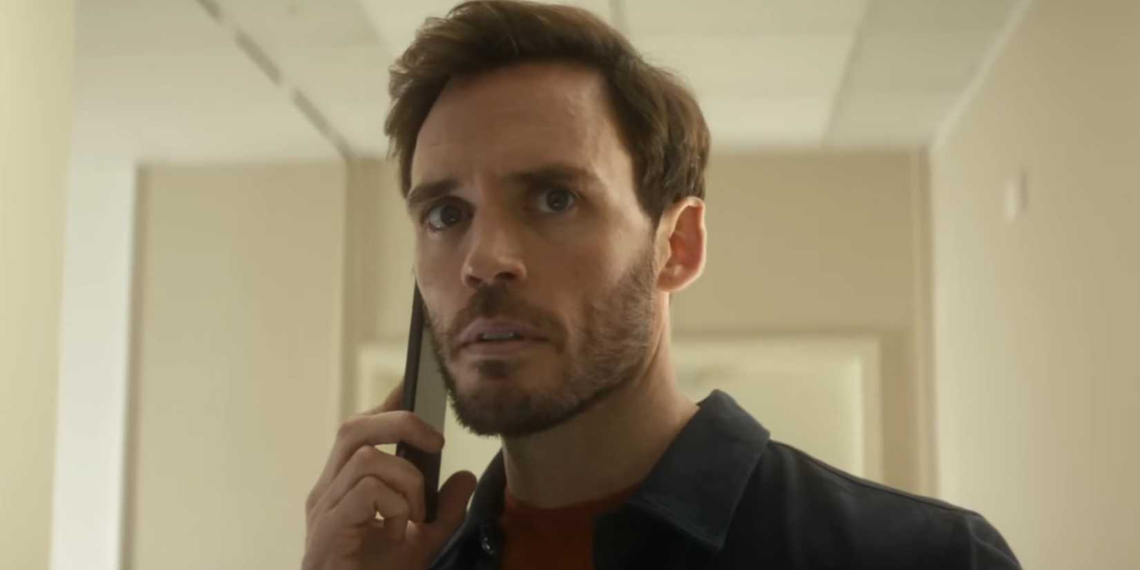 Sam Claflin as Laz looking worried while on the phone in Lazarus