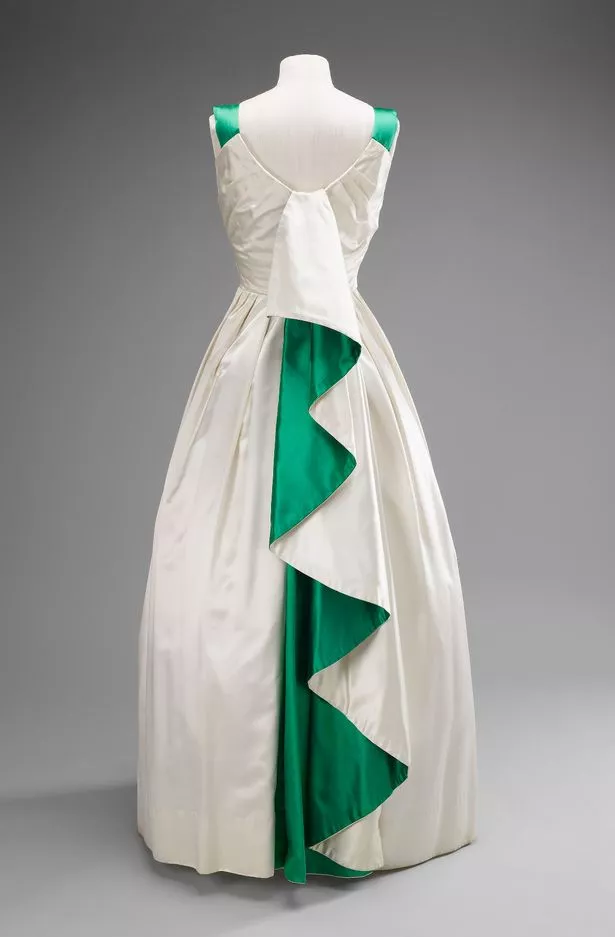 One of the dresses that will be on display is a gown, designed by Norman Hartnell, for a 1961 State Banquet in Karachi, which incorporates Pakistan’s national colors through a dramatic green pleat cascading down the back.