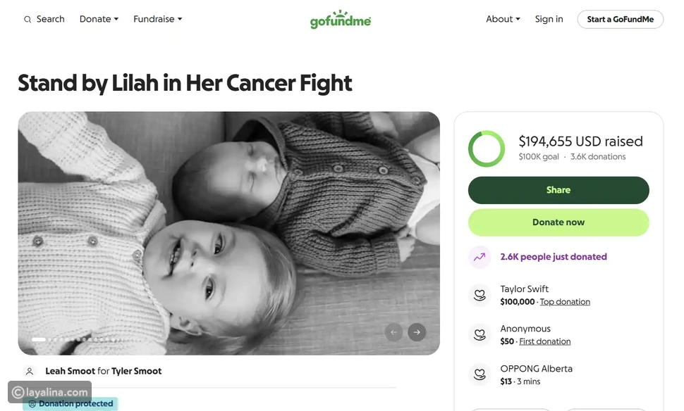 Sources revealed that Taylor Swift made a donation to help Lailah, an adult child, after being diagnosed with a rare disease. وائدواني من شركة عربة.