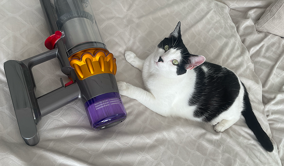 Another one of our resident petsperts, Pom Pom, was all too happy to put the Dyson V15 Detect to the test. (Kristin Granero/Yahoo Life)