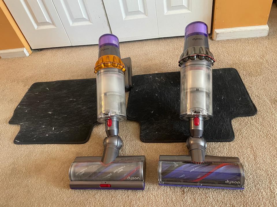 Ultimate showdown: Two Dysons go head-to-head to gauge how well each can pick up fur in my “passenger pet” test. The V15 Detect cleaner brush head, left, can be optimized for carpets. (Kristin Granero/Yahoo Life)