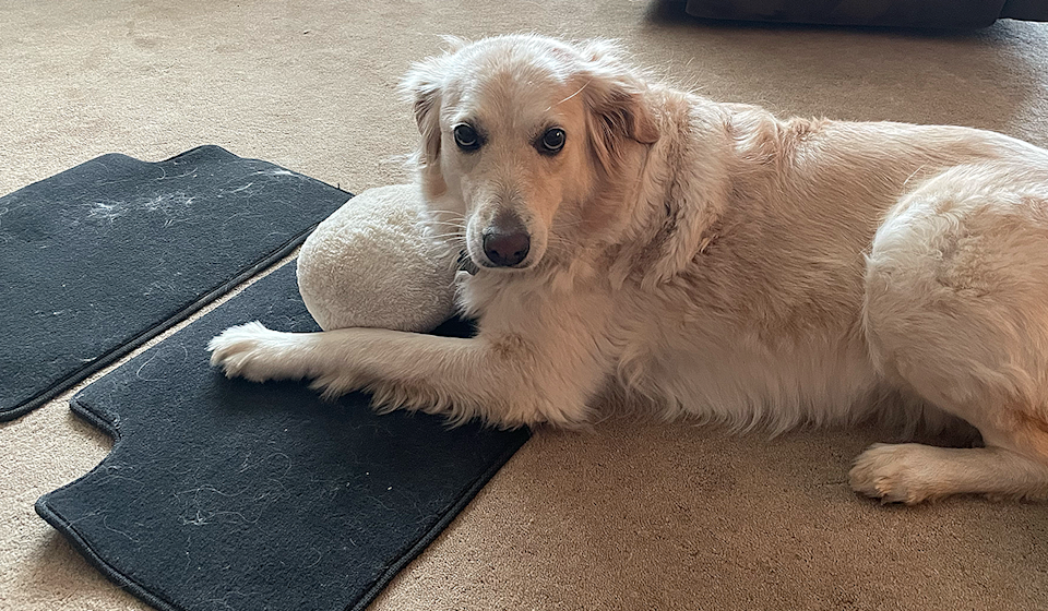 Paws-itively adorable: “Passenger pet” Kimber exhibited some prodigious shedding to help us test the best cordless stick vacuum for pet hair. (Kristin Granero/Yahoo Life)