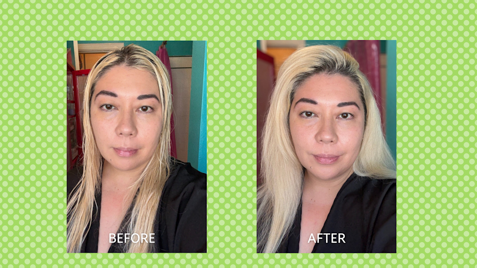 A before and after shot of Beauty Writer Marie Lodi's Hair AFTER NEXXUS ROT LIFT SPRAY ON A GREEN DOTTED BACKGROUND