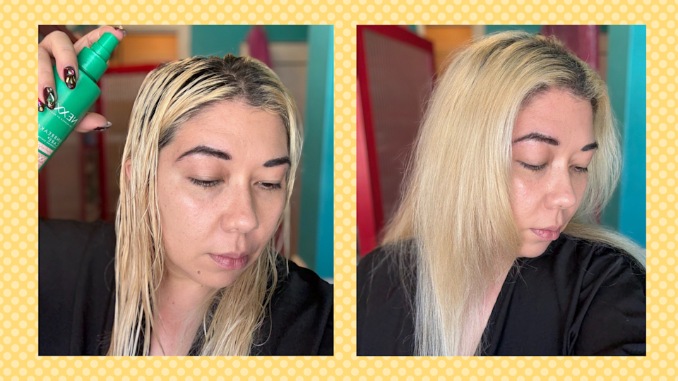 A before and after shot of Beauty Writer Marie Lodi Applying Nexxus Root Lift Spray Against Yellow Dotted Background