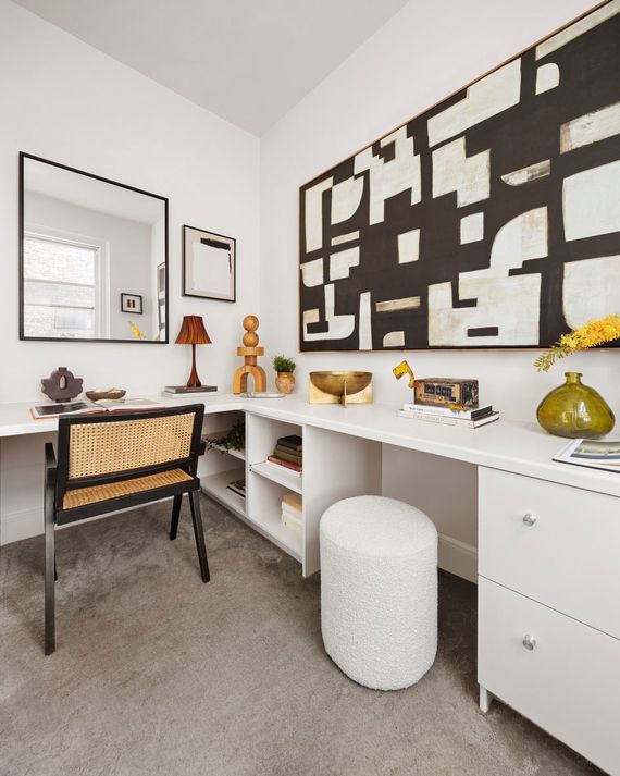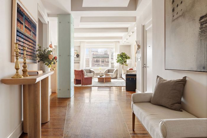 Apartments in the building, a 16-story co-op built in 1926, were designed as well classic floor-throughs, with living areas overlooking the park, and a warren of small rooms designed for maids to live and work in the rear. Over the years, owners opened up the layouts, and the last resident in 14B went even further, making the space less boxy by angling a wall that separates the living and sleeping areas. That created a bigger, wedge-shaped entry that led to a triangular living room. And even teensy details in the apartment followed the new line — like an angled kitchen counter, or a trapezoidal inlay in the wooden floor.
