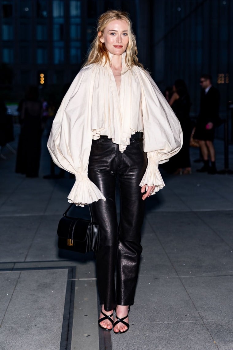 اخترت بلوزة العاجي بمعادة منفوخة, مع سروال جلدي الأسود وحذاء بكعم متكروزة.