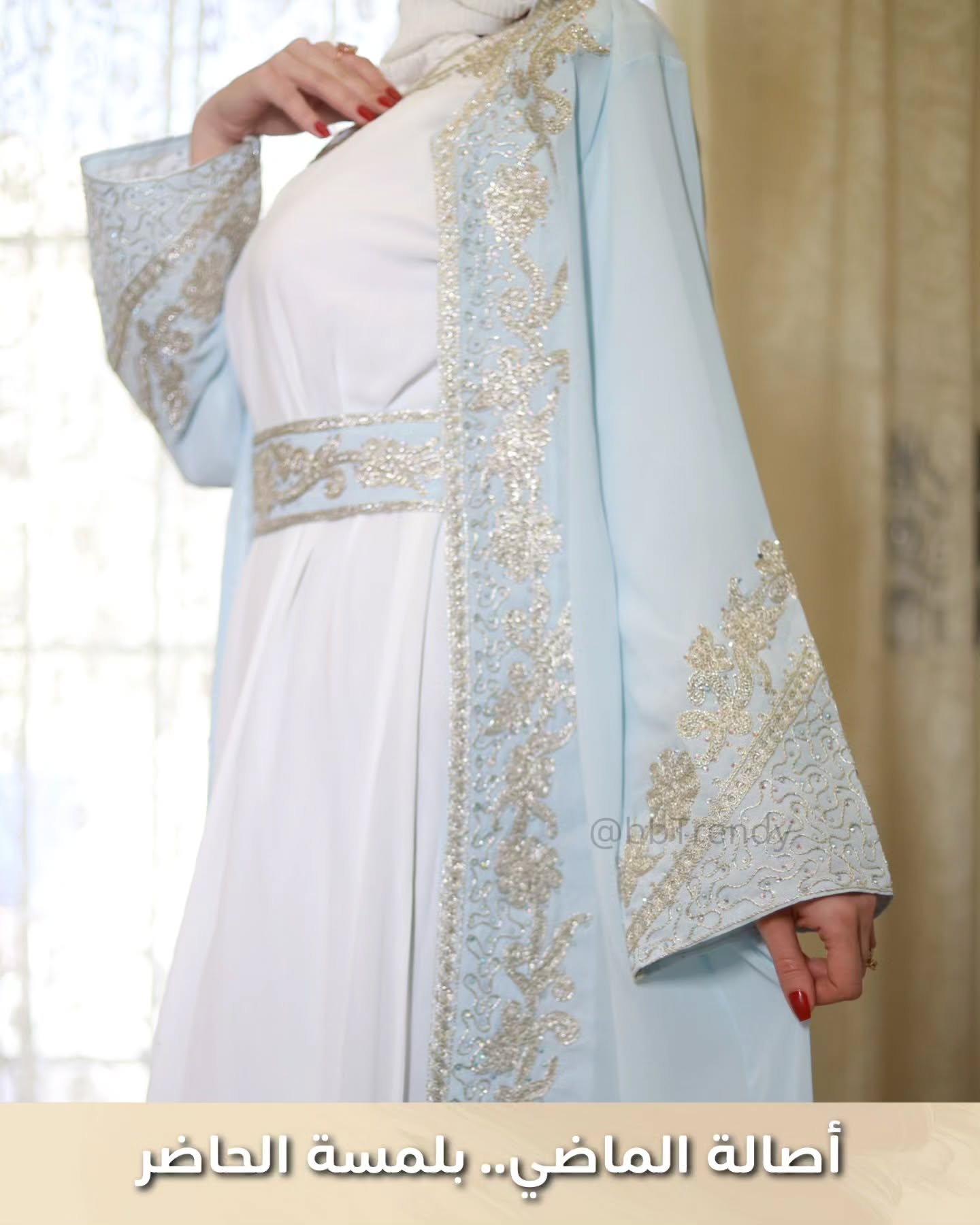 جلابية فاخرة من قطعتين بلون السماوي الهادئ تضيف لمسة أنثوية ملكية لستايلك!