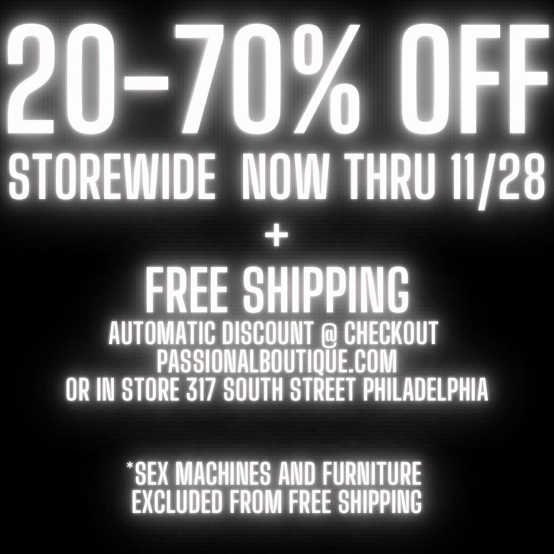 Image 1= black background with glowing text that reads, “save 20% – 70% off now through November 28 plus free shipping*free shipping excludes sex machines and furniture, automatic discounts taken at checkout www.passionalboutique.com, 317 South street Philadelphia