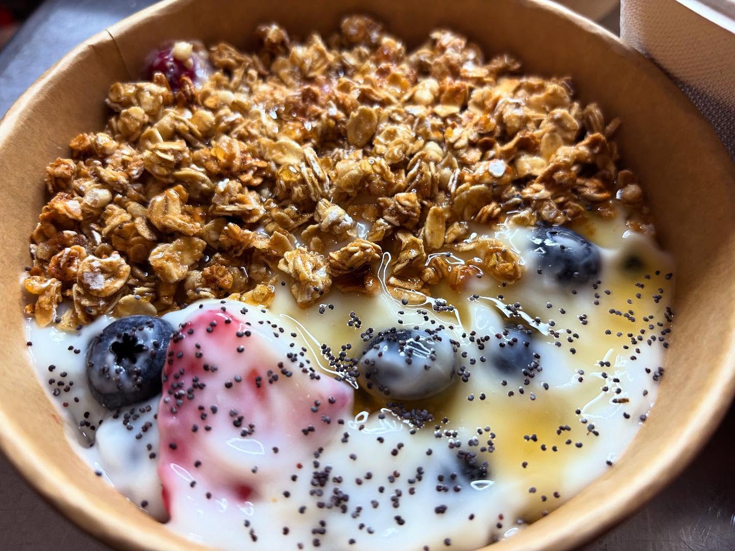 Poppyseed and honey yogurt, fruit and granola. This is a perfect protein snack to keep you full and energized throughout a busy day. Sign up for our weekly meal prep today and enjoy delicious, homemade snacks like these. 😀. Happy Friday!