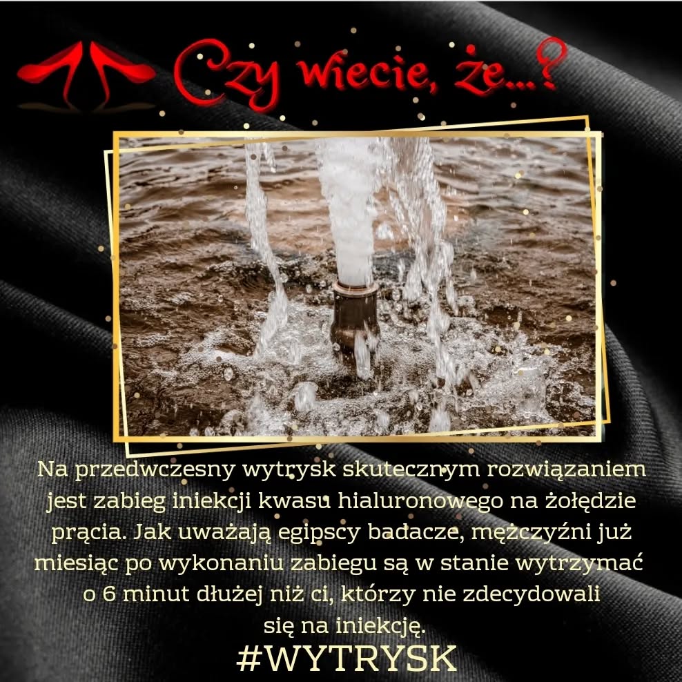 🎉Na przedwczesny wytrysk skutecznym rozwiązaniem jest zabieg iniekcji kwasu hialuronowego na żołędzie prącia. Jak uważają egipscy badacze, mężczyźni już miesiąc po wykonaniu zabiegu są w stanie wytrzymać o 6 minut dłużej niż ci, którzy nie zdecydowali się na iniekcję.